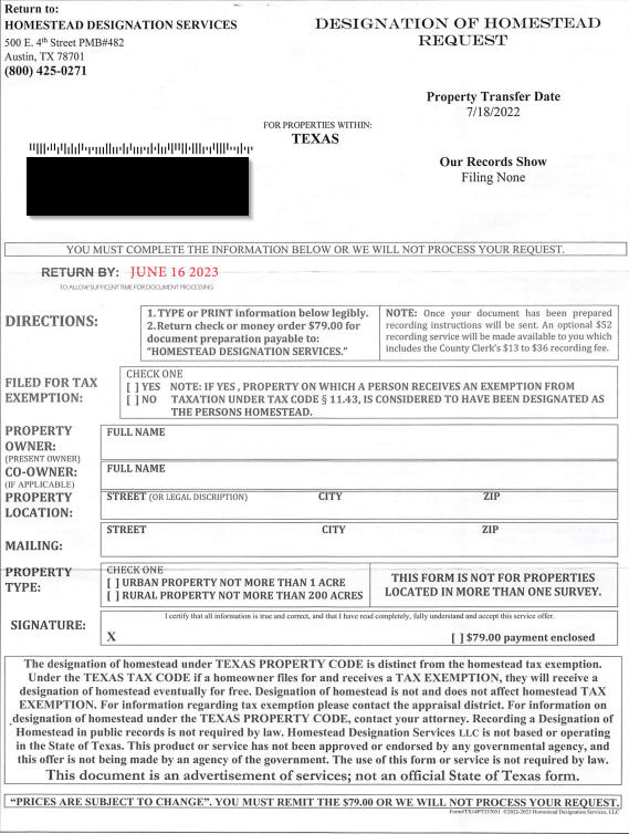 The Andrews County Appraisal District will never request you pay to file your Homestead.